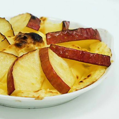 2. For the fruit gratin: Cut the apple or the orange as per your preference in wedges. Place the sponge cake in the ceramic bowl and cover it with custard cream. Arrange the wedges nicely on top of cream and press them carefully a little bit into the cream. Sprinkle the sugar over the entire bowl.