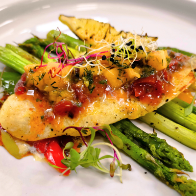Grilled Hake- Asparagus with Peppers, Lemon Butter, Tomato Relish & Mango Salsa