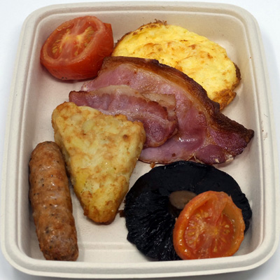 To a tray, add one piece each of sausage, mushroom, bacon, hash brown, fried eggs, and halved tomato. Cook as per oven profile and serve with toasted bread. For a takeaway option, use oven-safe disposable containers. Get in touch with us to learn more.