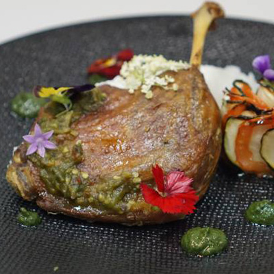 - Garnish with dots of the sambal Ijo puree, the sambal Ijo on the bottom side of the duck and the edible flowers.