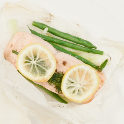 7 Cook using the oven profile, remove the salmon from the parchment bag and serve.