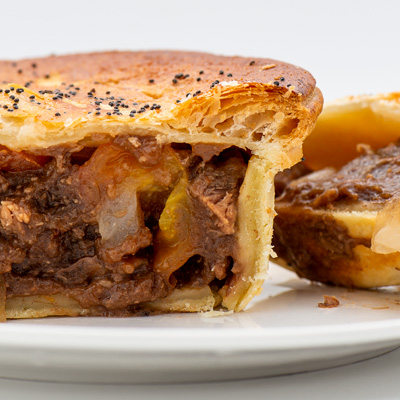 - Fill oven safe ceramic or eathernware dish with 4 ounces (115g) of stew. Cut puff pastry to size of dish and stretch over sides, brush with egg wash and top with sesame seeds. Refrigerate until order. By order place the dish on the tray.