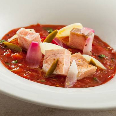 - Trim the swordfish in bigger cubes and season them with salt and pepper. Plate the cubes on top of the sauce and garnish with the onions.