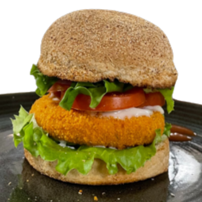 - Reheat the frozen par fried Burger patty (Stage 1) & assemble it in the burger bun. Serve it with Tomato Ketchup.